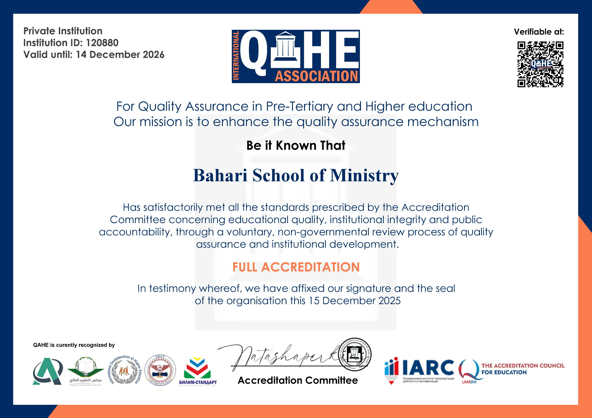 Bahari School of Ministry has been officially awarded international accreditation by the International Association for Quality Assurance in Pre-Tertiary and Higher Education (QAHE), affirming the institution’s compliance with recognized global standards of academic quality, governance, and institutional effectiveness.